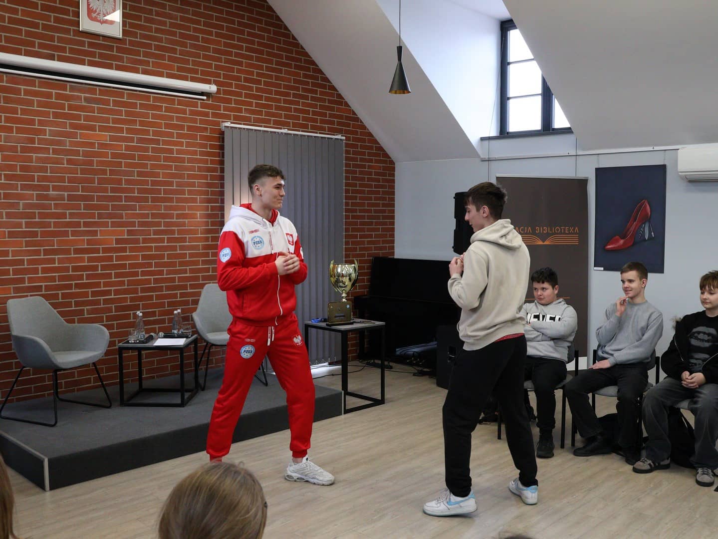 Nasz gość opowiadał młodzieży o kulisach swojej kariery – od pierwszych treningów, przez lata systematycznej pracy, aż po najważniejsze walki, którym towarzyszyła ogromna presja i odpowiedzialność. Nie zabrakło refleksji o wyrzeczeniach, dyscyplinie oraz codziennej rutynie, która – jak podkreślał mistrz – stanowi fundament każdego sukcesu.